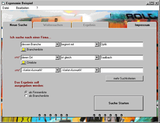 Optisch ist die ergnomische Version von ITusabilitydes gleichen Branchenverzeichnisses nicht so ansprechend, aber dafür auf Anhieb klarer zu verstehen. Für ein Werkzeug wie dieses ist das unumgänglich, daher kommt für Usability-Spezialisten immer Funktionalität vor Optik!