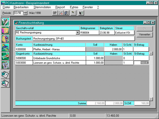 Hier der Buchhaltungsteil des Projektes "PC-Handwerker", bevor es das ITusability überarbeitete. Augenfällig ist, daß hier beachtliche Mauswege zurückzulegen sind, da die natürliche Arbeitsweise von links oben nach rechts unten nicht eingehalten wurde. Des Weiteren fehlt eine klare Trennline zwischen dem Buchungskonto und den Gegenkonten. Bereits angelegte Buchungen sind abstrakt und weit vom Buchungsbeleg in die Menüleiste weggerückt, wo sie ebenfalls nicht sofort erkennbar sind. Die Latte der Fehler in diesem Programm ließe sich noch lange weiterführen. Ohne Lernaufwand ist der Anwender auch hier nicht in der Lage, zu einem schnellen Ergebnis zu kommen.